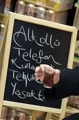 Tahtada “Alkollü telefon kullanmak tehlikeli ve yasaktır” ifadesi yer alıyordu.