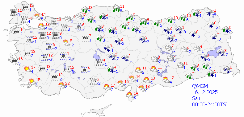 Meteoroloji Genel Müdürlüğü 16 Aralık Salı günün hava durumu raporunu paylaştı. Yapılan tahminlere göre bugün ülkemizin kuzey, iç ve doğu kesimlerinin parçalı ve çok bulutlu, Orta ve Doğu Karadeniz kıyıları ile Bartın, Sinop, Karabük, Batman, Mardin ve Siirt çevrelerinin yağmur ve sağanak, İç Anadolu’nun doğusu, Orta ve Doğu Karadeniz’in iç kesimleri, Doğu Anadolu’nun kuzey ve doğusu ile Kastamonu, Çankırı ve Diyarbakır çevrelerinin karla karışık yağmur ve kar yağışlı, diğer yerlerin az bulutlu ve açık geçeceği tahmin ediliyor.